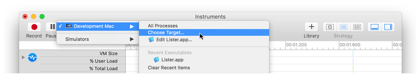Tip: If you attempt to profile an app you’ve targeted, but the app isn’t actively running, Instruments launches it automatically.