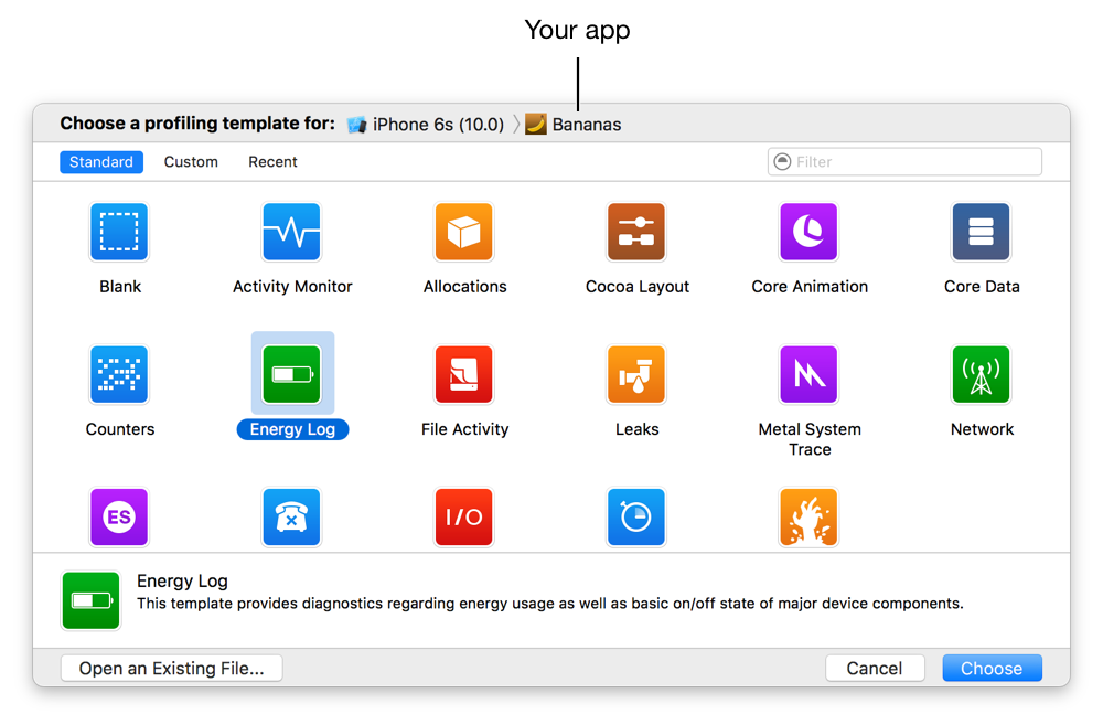 Instruments launches, and the profiling template selection dialog appears. Note that your app is automatically selected in the target device and process lists.