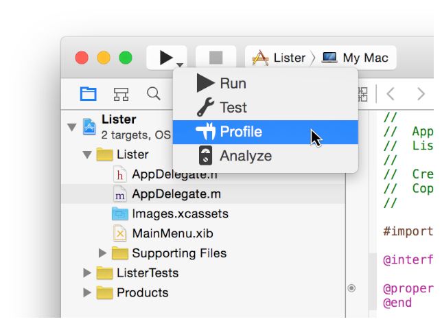• Click and hold the build menu in the Xcode main window, and choose Profile from the menu that appears.
