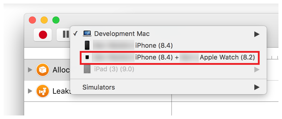 Note: When profiling an Apple Watch, your development iPhone acts as a proxy, relaying information between the Apple Watch and Instruments.