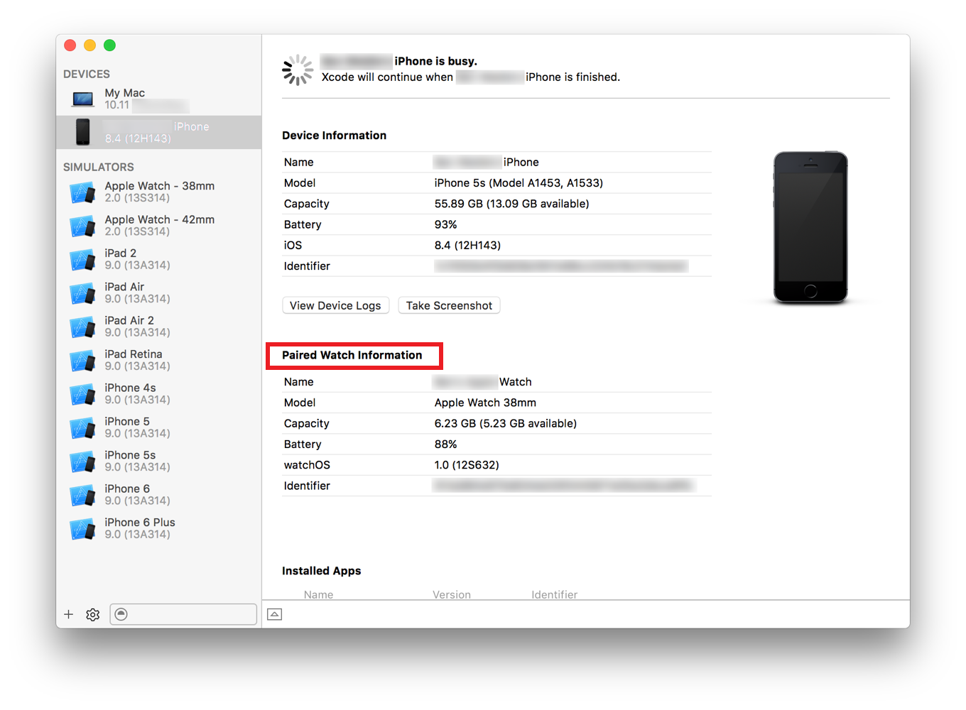 4. Connect the iPhone that’s paired with your Apple Watch to your development Mac by a USB or Lightning cable.