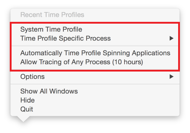 Time Profile Specific Process. Starts the Time Profiler instrument with a specific app from the submenu.