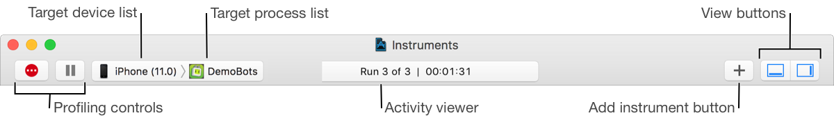 The toolbar of the trace document lets you start, pause, and stop data profiling, add instruments, hide and show panes, and more.