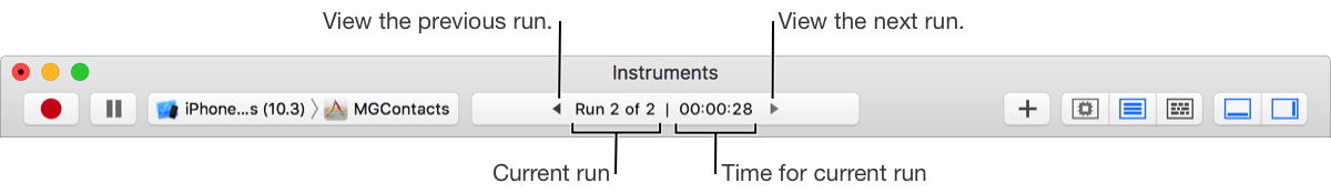 A trace document can record data over multiple runs of your app. When doing so, it doesn’t discard previously recorded data. The Activity area in the Toolbar shows the total number of runs, the current run, and the time for the current run. Changing the current run updates the data for each instrument in the trace document to the current run. The data is shown only for instruments that were a part of the trace document during the chosen run.