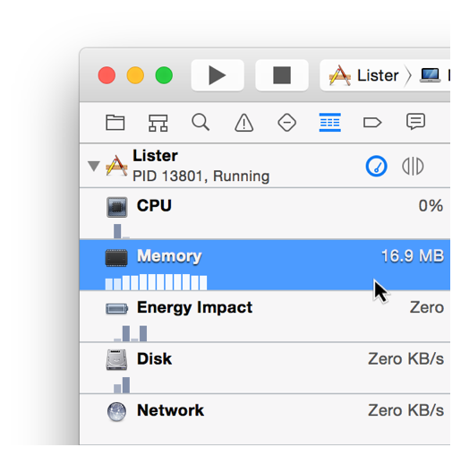 The Xcode debug navigator includes several gauges that monitor an app as you test and debug it. These gauges track a variety of factors, including CPU usage, memory, and energy impact, and can alert you to potential problems that may impact performance, power consumption, and more. If you identify a trend you wish to investigate further while testing your app, you can transition monitoring over to Instruments for more detailed analysis.
