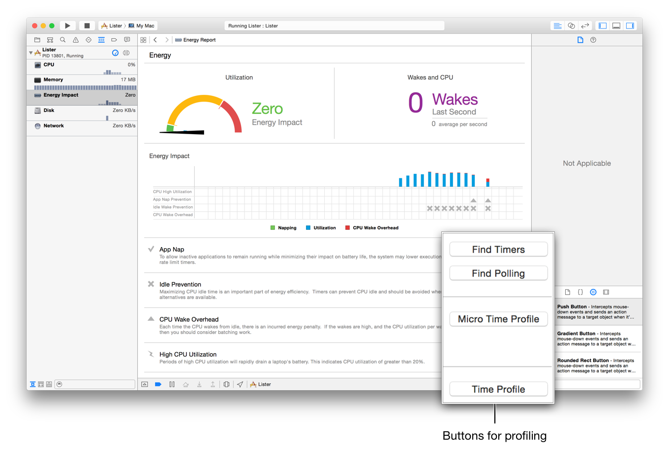 Note: Not every Xcode gauge has a Profile in Instruments button. The Energy Impact gauge, for example, includes several buttons for initiating different types of profiling sessions in Instruments.