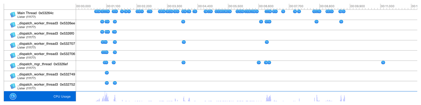 CPUs: Displays a list of CPU cores, along with their usage over time, in the timeline pane. Only available when a trace document contains instruments that record CPU data.