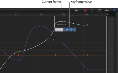 The Keyframe Editor provides an ideal environment for manipulating keyframes because you can simultaneously see their values, placement in time, and how the changes affect the interpolative curves surrounding them.