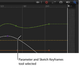 The Sketch Keyframes tool (next to the Edit Keyframes tool) allows you to sketch animation curves in the Keyframe Editor graph area, creating keyframes as you go. To sketch a curve, the parameter to animate must first appear in the parameter list. See Custom Parameter Sets for methods of displaying curves.