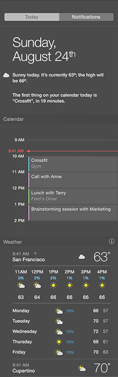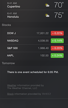 Open Notification Center to see widgets for your calendar, reminders, stock prices, the weather forecast, your favorite social networks, and more.