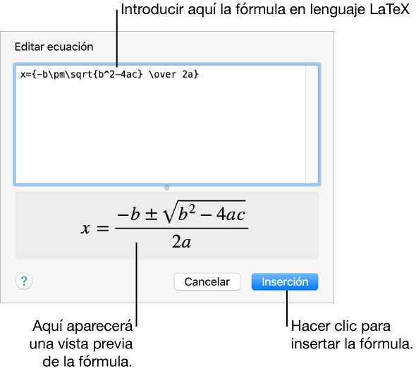 La fórmula cuadrática escrita con LaTeX en el campo de ecuación y la previsualización de la fórmula a continuación.