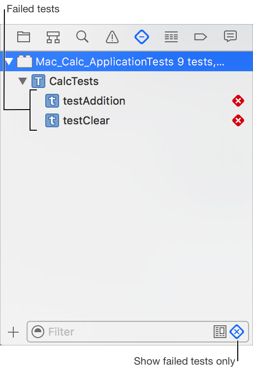 ) at the bottom of the Test navigator to show only the failed tests.