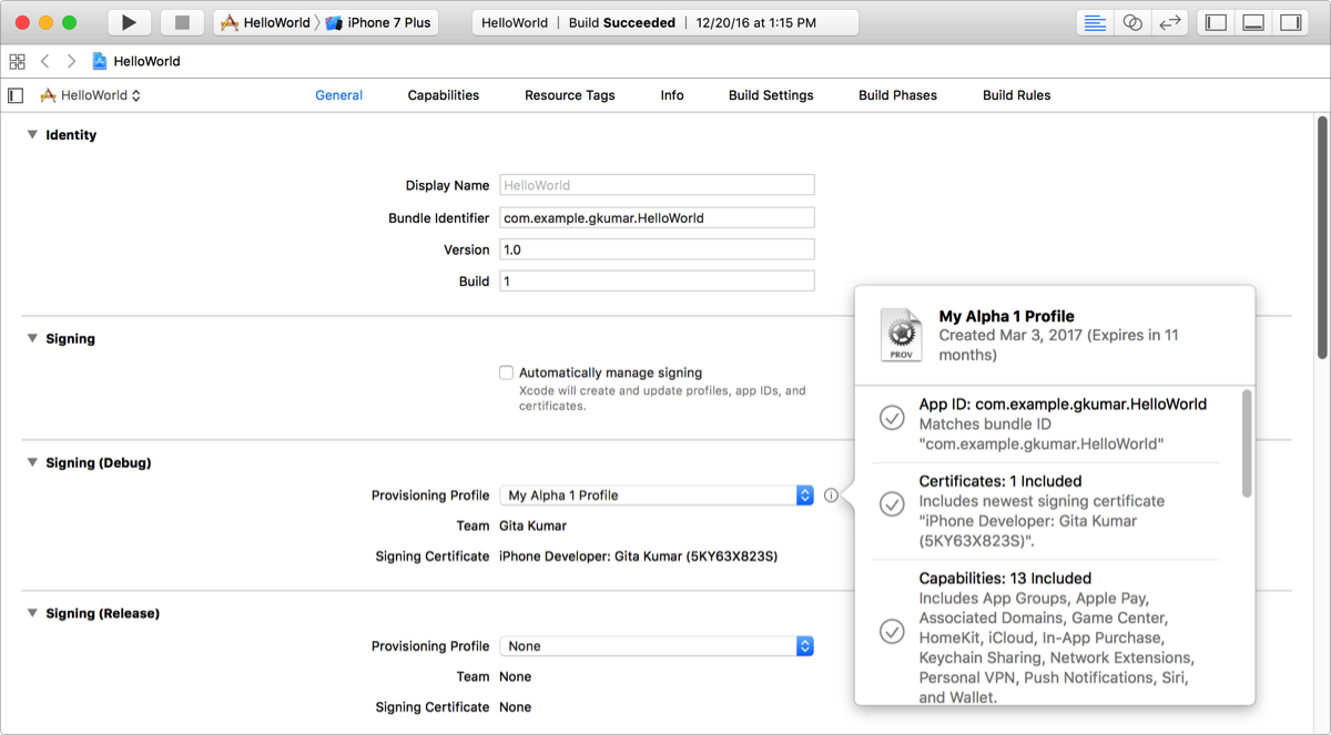 If successful, the Team and Signing Certificate change to match the signing assets in the provisioning profile. You can click the information icon to view the provisioning profile details.