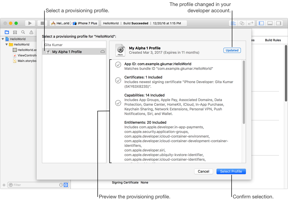 If the provisioning profile in your developer account is more recent, an Updated badge appears in the upper-right corner.