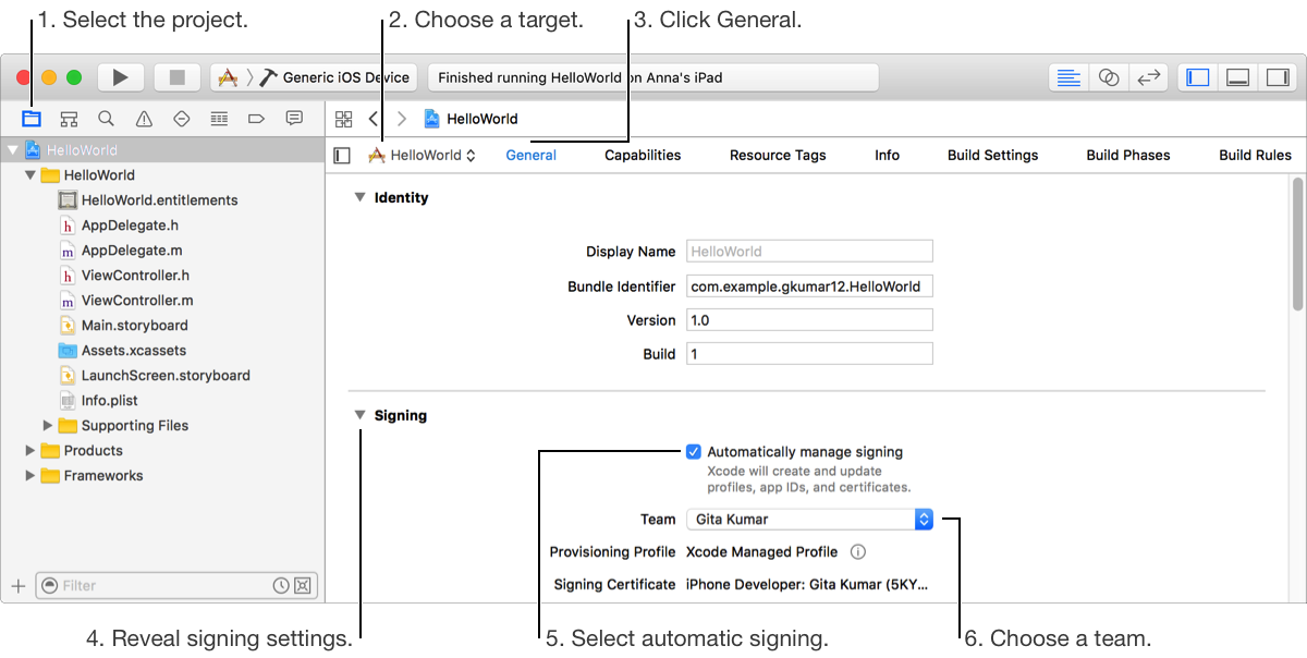 In order to code sign your app, each target in your Xcode project must be assigned to the same team. If you enroll as an individual, you’re considered a one-person team. If you are not a member of the Apple Developer Program, Xcode will create a personal team for you.