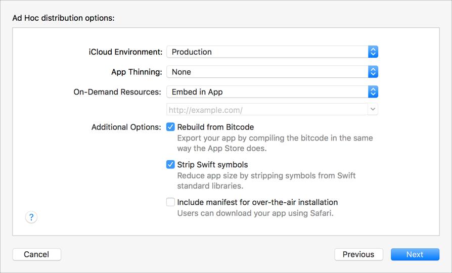 If you checked “Include manifest for over-the-air installation”, enter details about your web server in the “Distribution manifest information” sheet that appears, then click Next.