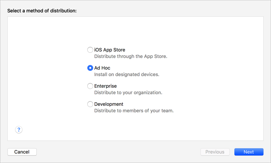 The type of certificate and provisioning profile used to sign the app depends on the distribution method you select. To learn about the distribution methods, go to Distribution methods.