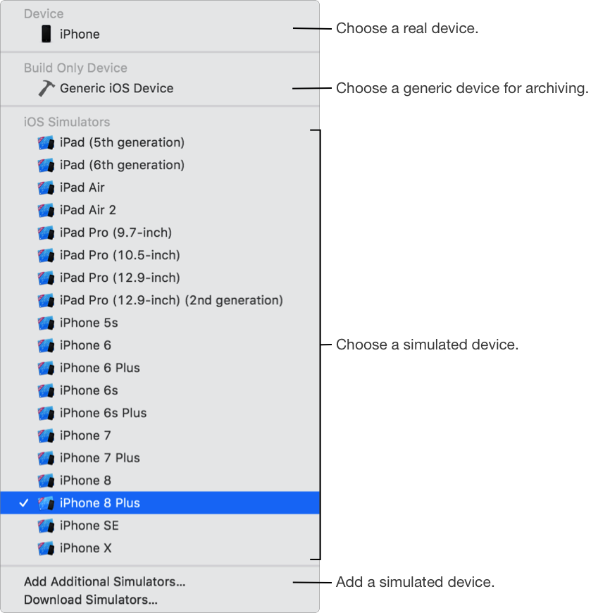 Next choose a run destination from the Scheme pop-up menu in the toolbar. The run destination determines where the app runs after it’s built. For macOS apps, the run destination is the Mac running Xcode. For other apps, you can choose a simulator of a product family running a version of the operating system, or a device connected to your Mac. To test your app without a device, choose a simulator from the Scheme pop-up menu.