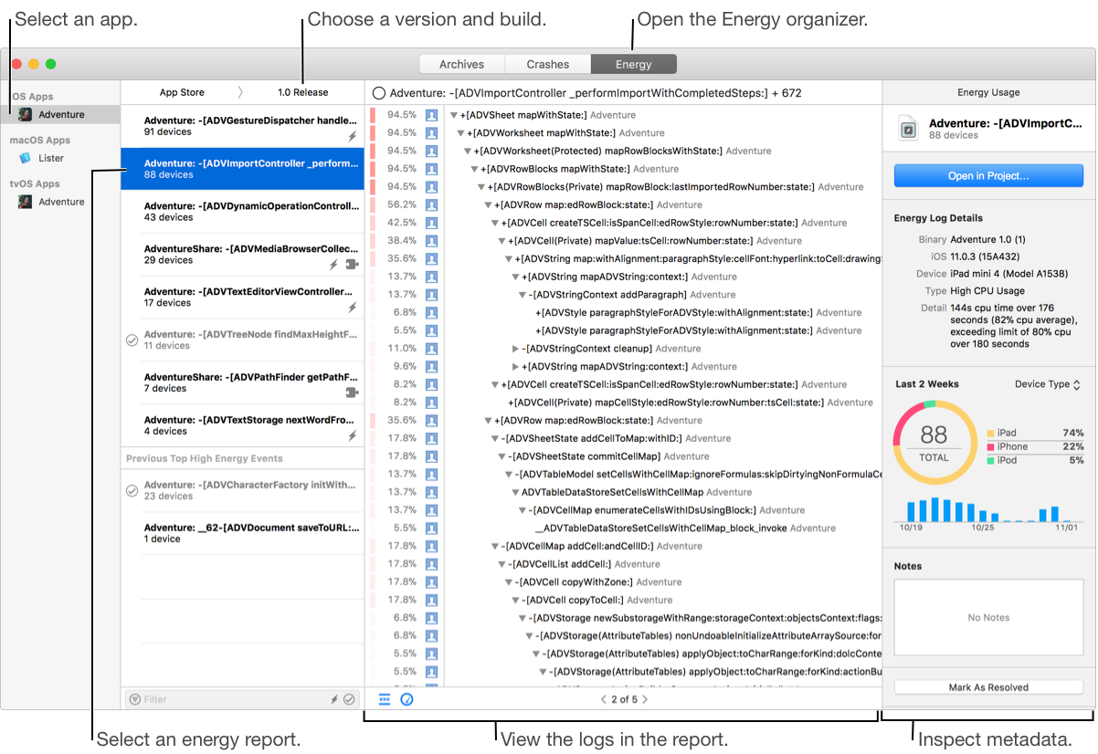 Use the first two columns to select an energy report for your app, version, and build. In the detail area, view the energy report including the logs and go to the source code where an event occurred. In the inspector, view and add additional information about an energy report. If the Energy organizer is empty, go to If no crash or energy reports appear in the organizer and review Supported energy reports.