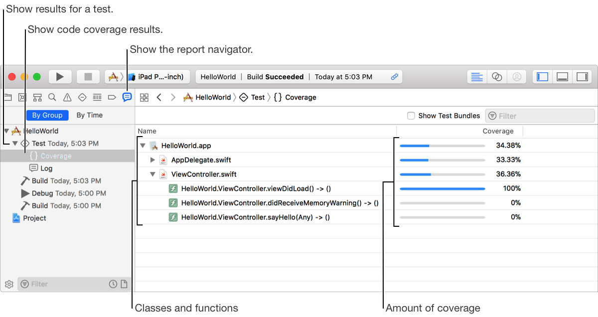 Code coverage enables Xcode to use the compiler to gather statistics about your source code and display the results after tests are run. The Report navigator shows where methods and functions were not reached by tests.