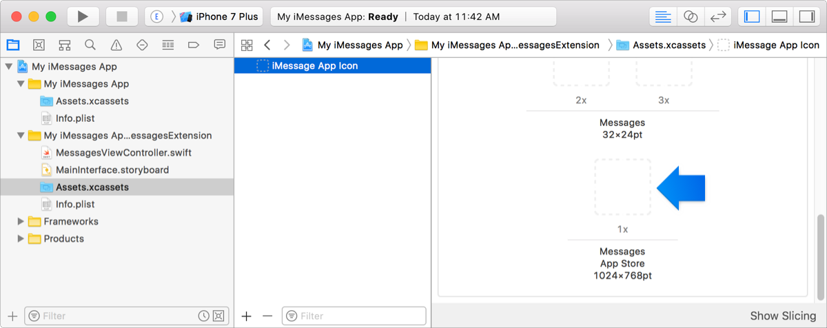 For the iMessage apps, drag an icon to the App Store iOS well located in the AppIcon image set of the iOS target. Then drag an icon to the Messages App Store well in the iMessage App Icon image set of the MessagesExtension target.