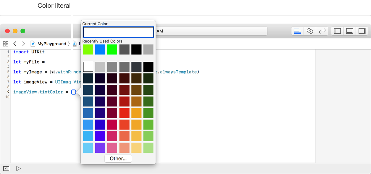 Create literals in your playground code when the value of a color, file, or image does not need to change. You can use the same literal in multiple places in your playground. The types of literals are:
