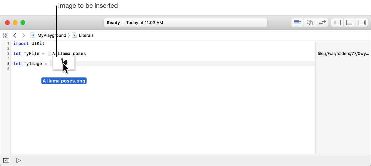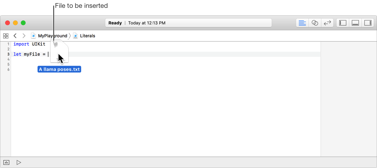 In the following screenshot, myFile is set to a file literal that references the file A llama poses.txt. The file is dragged into the playground from the Finder. The file is copied to the top-level resources folder of the playground.