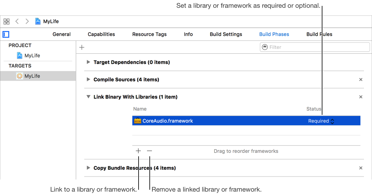 Use the General pane of the project editor to specify the libraries and frameworks a target needs to run. You can link to libraries and frameworks in the target’s SDK, or to external libraries and frameworks.