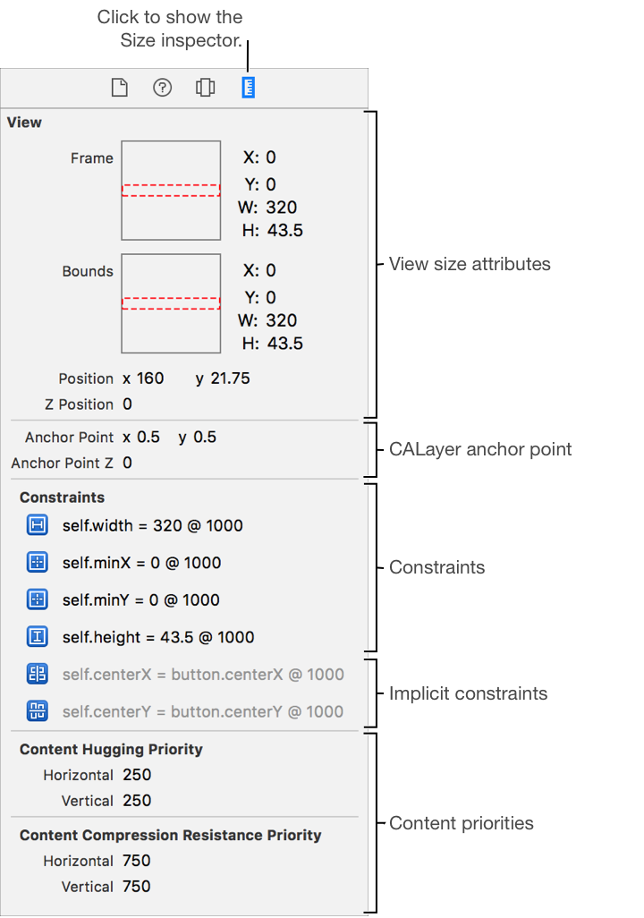 Use Size inspector to view run time information size and constraint information for an object in the view debugger. To open the Object inspector, click the Size button (