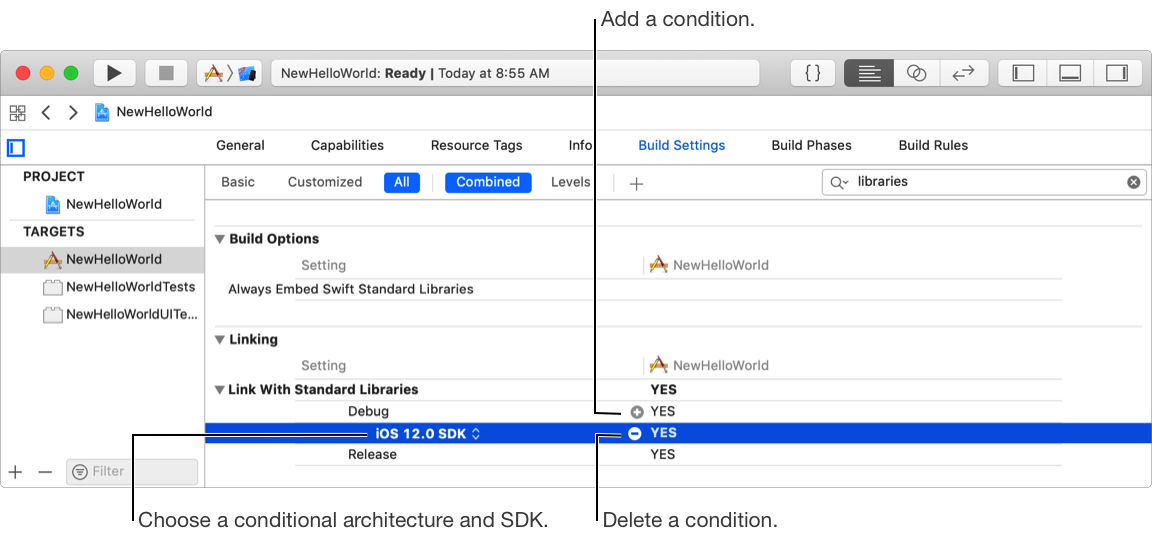 To remove a conditionalized build setting, hover the pointer over a condition and click the Delete button (–).