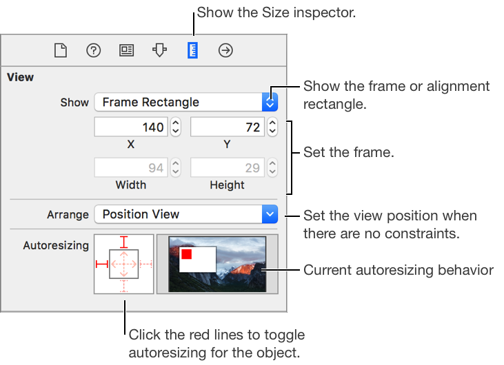 To change the position or size of a view, type a new number in the X, Y, Width, or Height fields. To change the autoresizing behavior of a view without constraints, click the red lines in the autoresizing box. The image on the left animates to show the current autoresizing behavior.