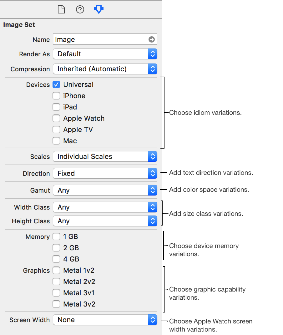 In Interface Builder, you can add, remove, and edit variations of an asset for different device traits.