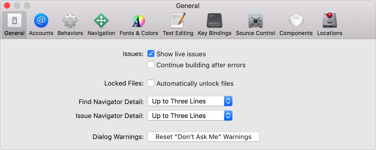 Use General preferences to manage general environment settings, such as the amount of detail displayed in the Find navigator and Issue navigator, whether runtime errors occur, and whether building continues when errors occur.
