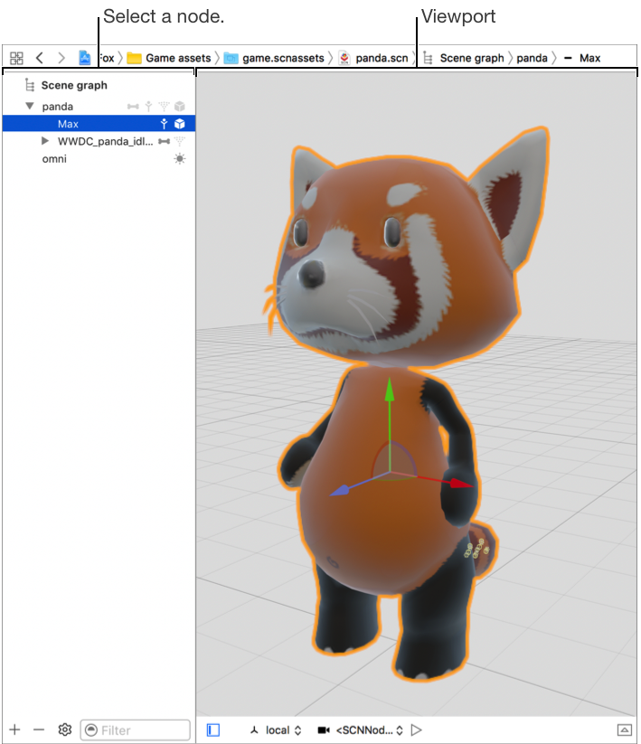 In the SceneKit scene editor, use the viewport and the scene graph view to change the perspective of the animation preview.