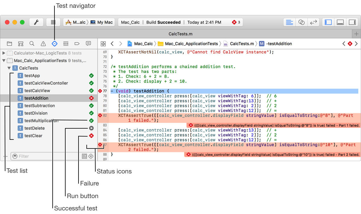 After running tests, status icons appear in the Test navigator. A green diamond with a checkmark indicates that a test has passed and a red diamond with an “X” indicates that a test has failed. When viewing the source code for your tests, these same icons appear in the gutter of the source editor.