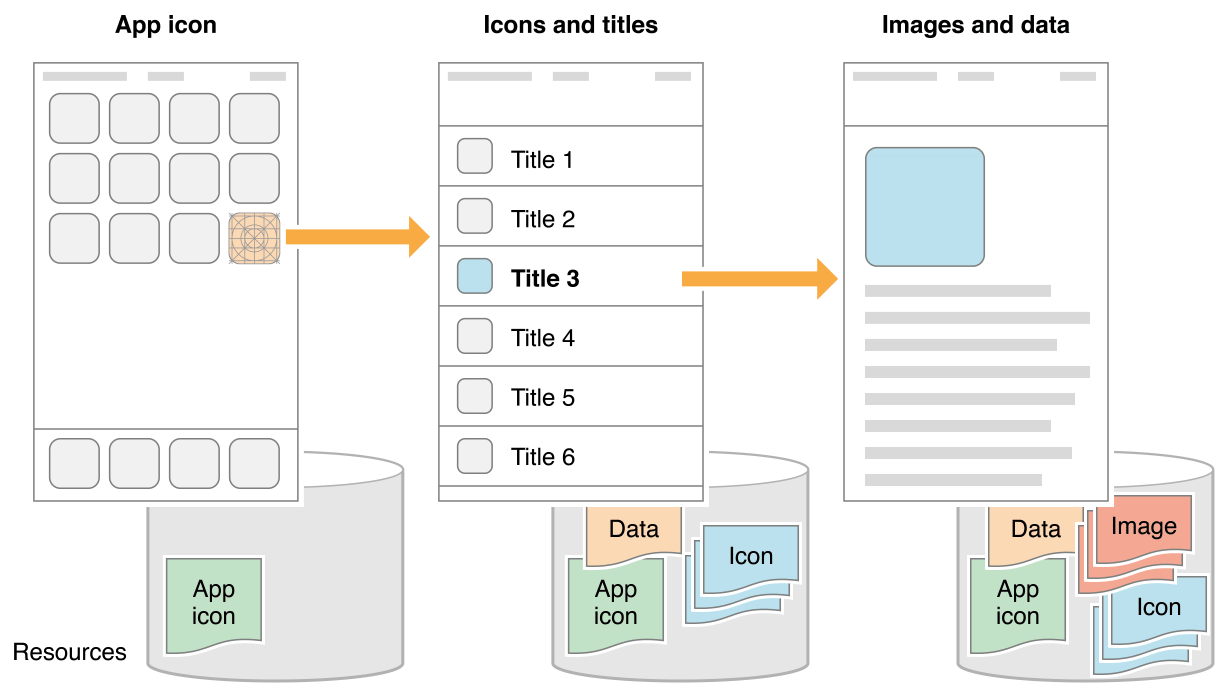 For example, a master-detail app may divide resources into levels and request the next level of resources only when the app anticipates that the user will move to that level. Similarly, the app can request In-App Purchase resources only when the user makes the corresponding in-app purchase.
