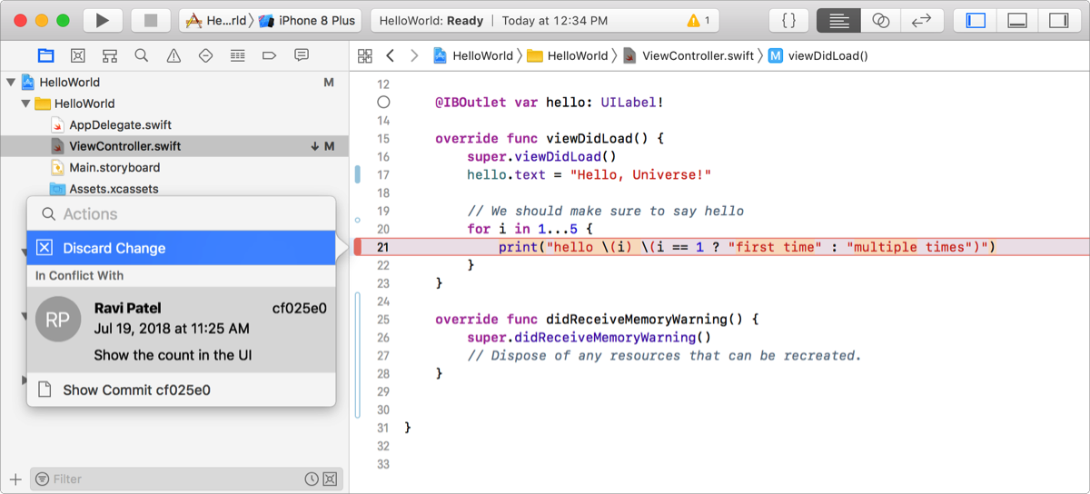 If you choose Discard Change, choose Source Control > Pull to pull the other person’s changes.
