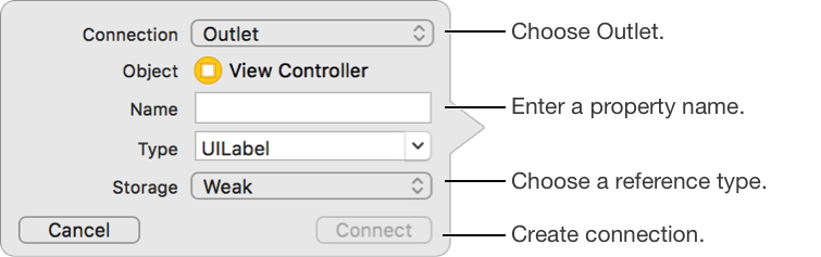 4. In the popover that appears, choose Outlet from the Connection menu, enter the property name, and choose a storage reference type.