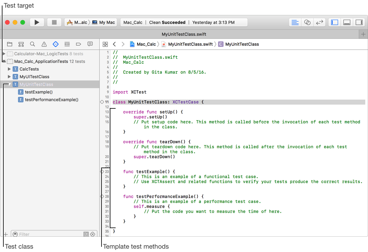 A new class is added to the target, appears in the Test navigator, and opens in the editor area. The new class includes setUp, tearDown, testExample, and testPerformanceExample template methods.