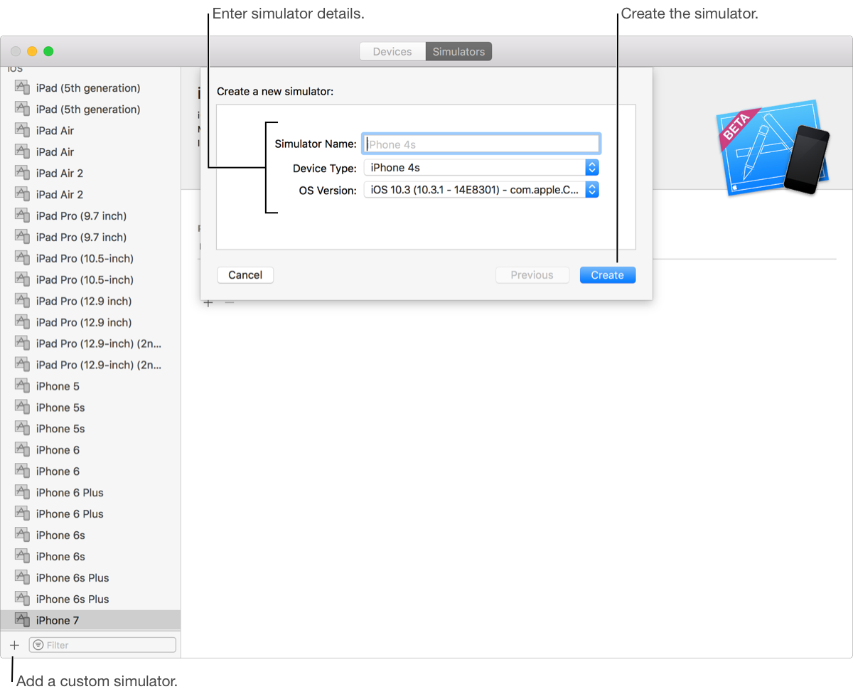 In the sheet that appears, enter a simulator name, choose a device type, and choose an OS version.
