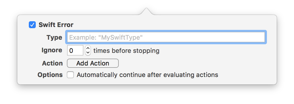 3. Optionally, Control-click the breakpoint, choose Edit Breakpoint, and configure the behavior of the breakpoint. You can set it to halt execution on a specific type of Swift error, rather than all Swift errors (the default). You can also configure actions to run when the breakpoint is encountered, and set other breakpoint options.