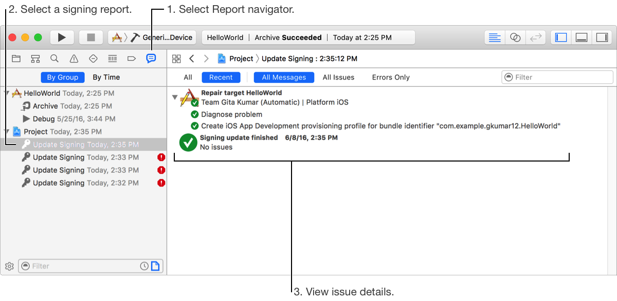 If you use automatic signing, Xcode identifies, diagnoses, and resolves signing issues for you. If you want to know more about an issue, view the signing report in the Report navigator. If a code signing error occurs when you build an app, view details in the Build report.