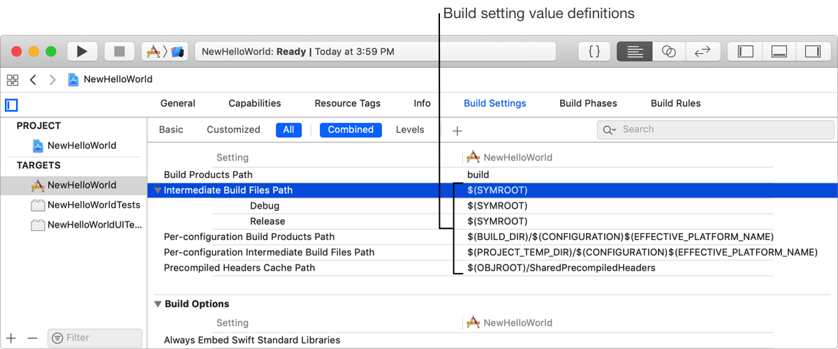 For example, if the Intermediate Build Files Path (OBJROOT) build setting references the Build Products Path (SYMROOT) build setting, whose value is set to build, then the value of Intermediate Build Files Path (OBJROOT) also appears as build.