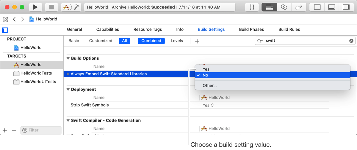 Choose or enter a value for the build setting or for a particular build configuration of the build setting.