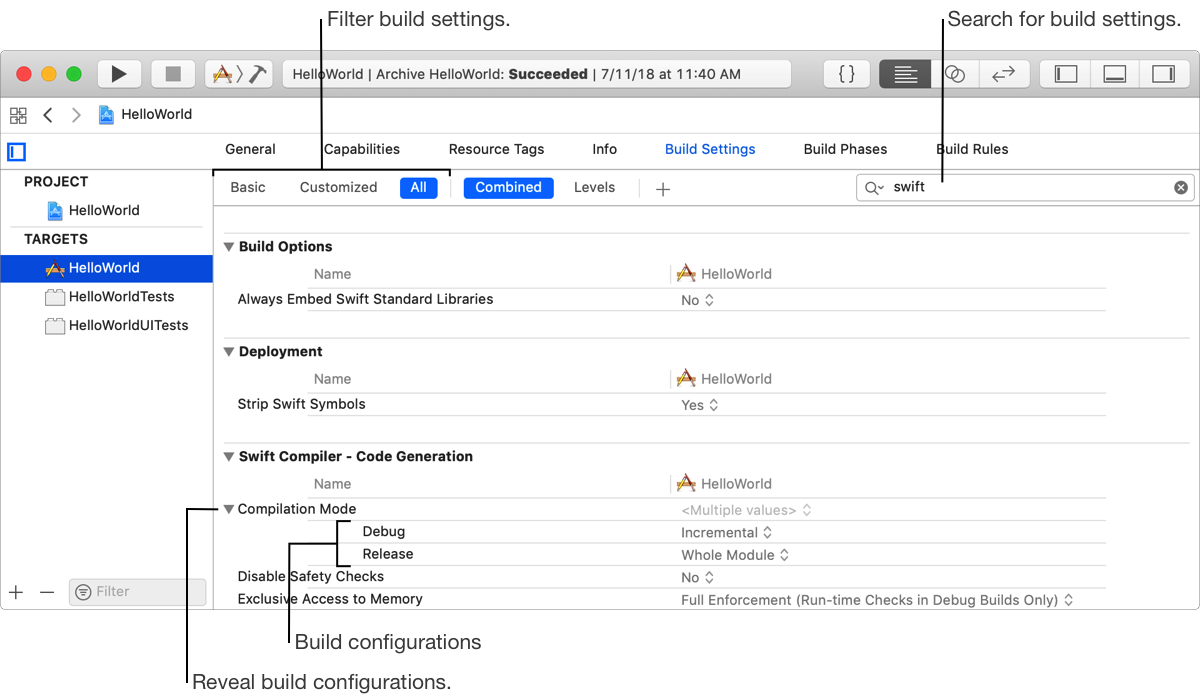 To quickly find a build setting, search for the build setting or filter build settings.