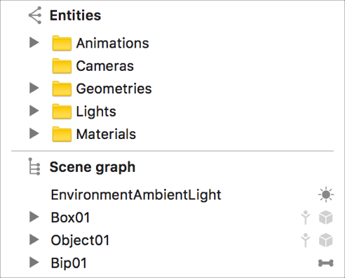 Note: If scenes are created outside Xcode, the Entities list appears above the scene graph list. Entities are separated into folders for animations, cameras, geometries, lights, and materials.