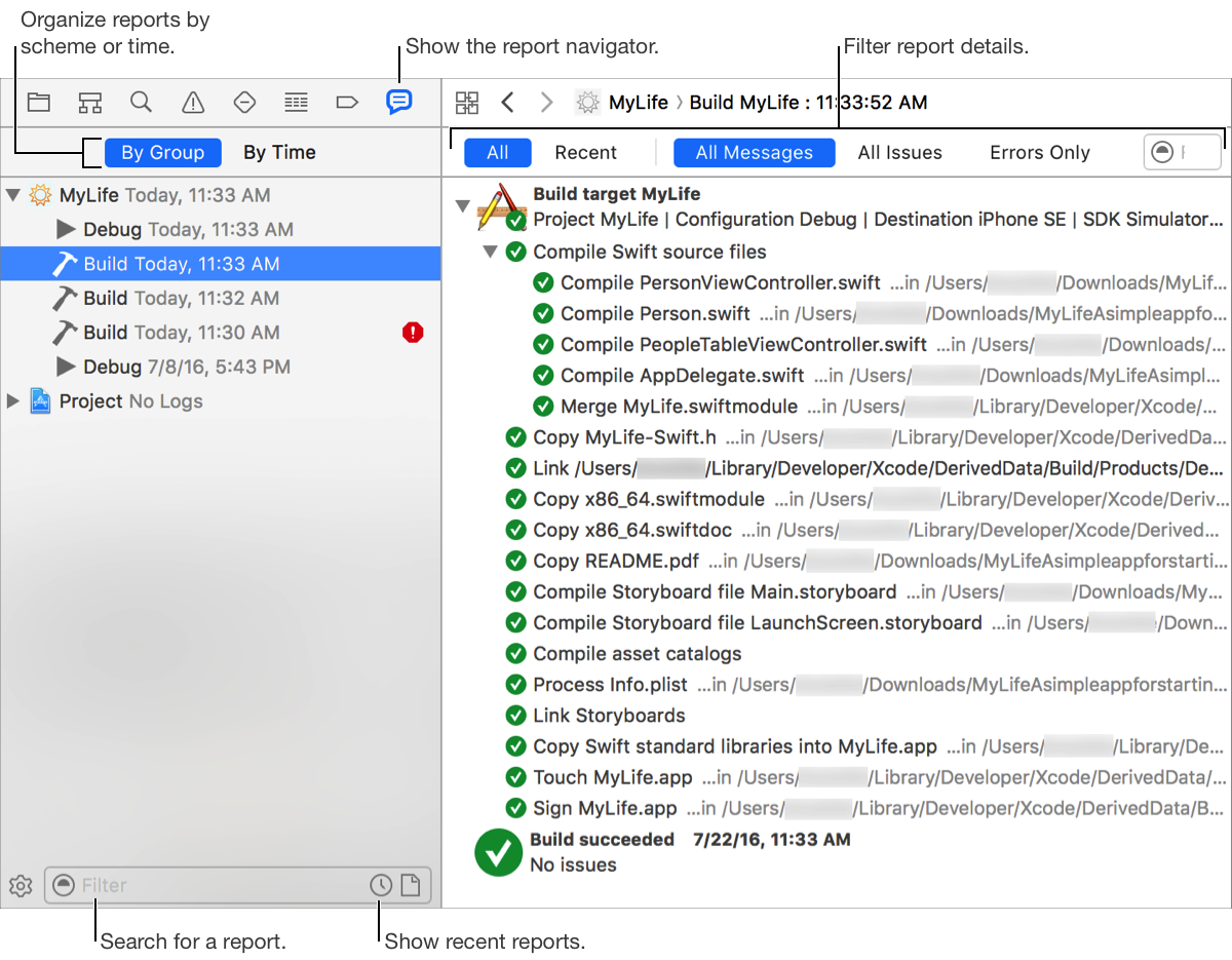 Use the Report navigator to browse the reports and logs that Xcode generates during your development process, such as task reports, debugging session logs, and bot reports. Select one to open it in the editor area.