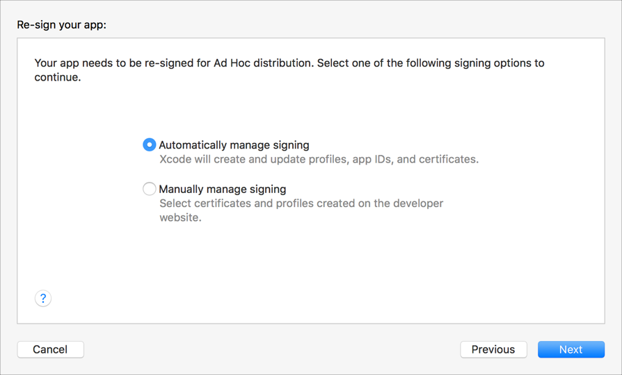 To learn about the signing options, go to Distribution signing options. If you select “Manually manage signing”, go to Manually manage distribution signing for alternate steps.