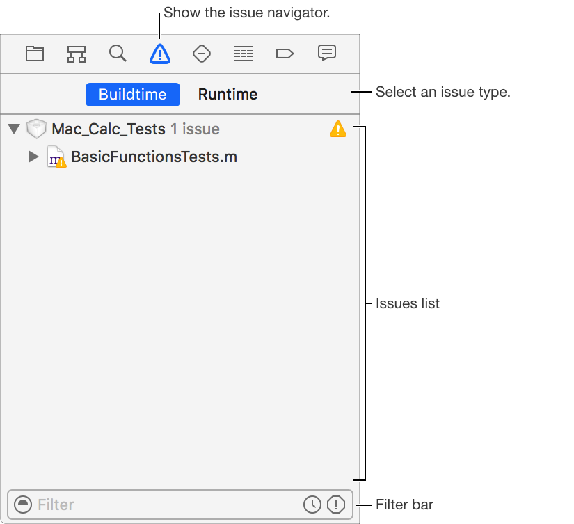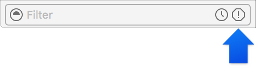Use the Issue navigator to display issues found when opening, analyzing, and building your project. If you click an error or warning icon in the toolbar, the Issue navigator opens automatically. Otherwise, to show the Issue navigator, click the Issue navigator button (