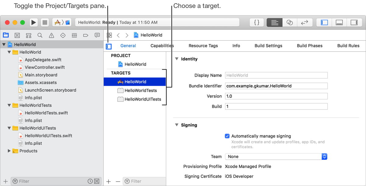 Projects can have multiple targets—multiple apps and multiple configurations of the same app. A target specifies a product to build, such as an iOS, macOS, tvOS, or watchOS app. Most projects you create from a template have one target for the main app and other targets for test apps. For watchOS apps, there’s a target for the iOS app, the WatchKit extension, and the WatchKit app. To view the targets, click the Project/Targets button in the project editor.